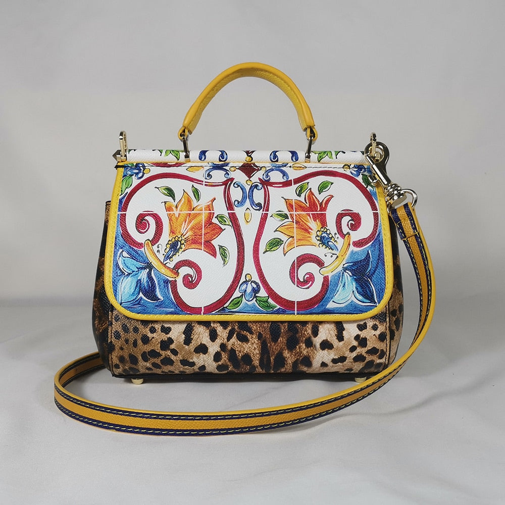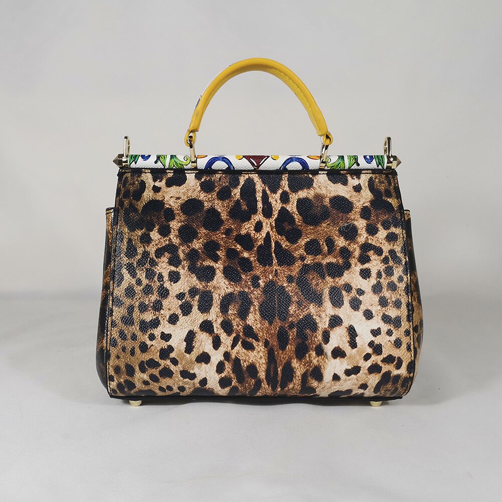 The Dulce Leopard Handbag is an elegant statement piece. Made with Italian motif, it features a striking leopard print, perfect for a fashionable and sophisticated look. Its eye-catching design ensures that you will be the envy of your friends.