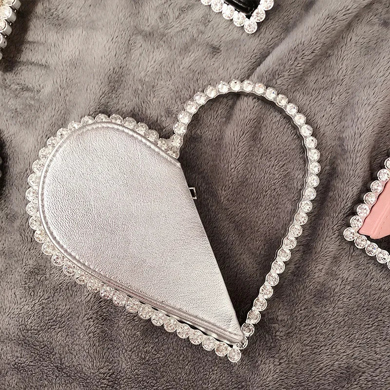 Elevate your style game with our exquisite Demi Heart Clutch, crafted from premium vegan leather. Its distinctive heart frame shape and dazzling rhinestones make it truly unique and eye-catching, perfect for adding a touch of glamour to any outfit.
