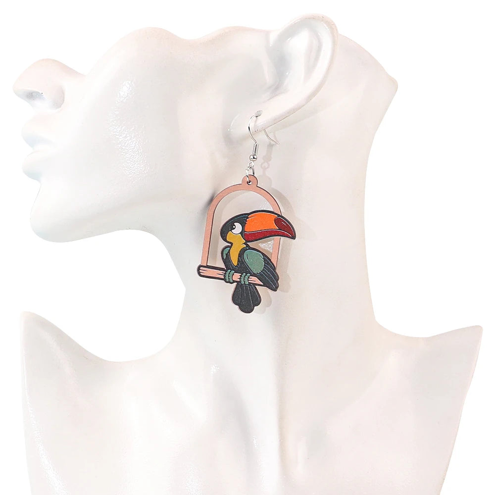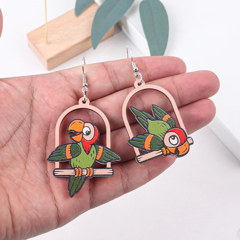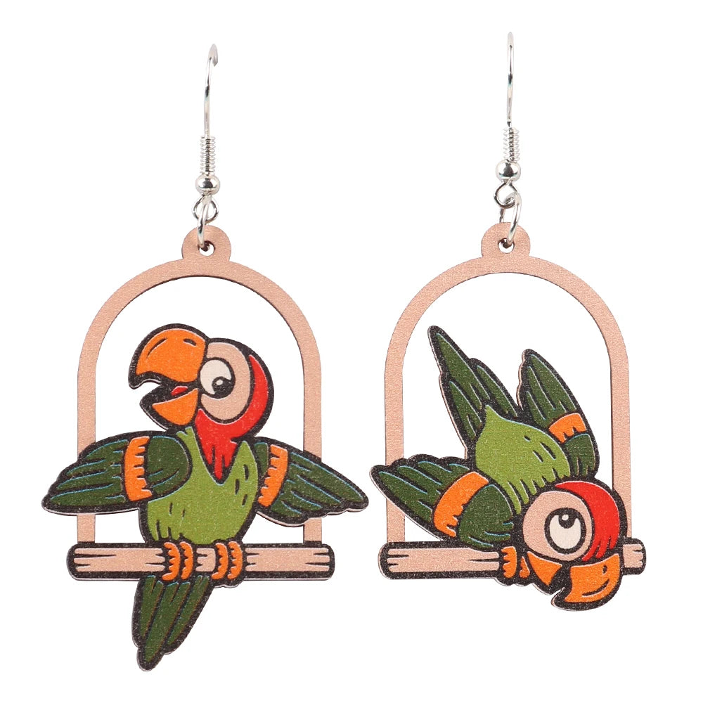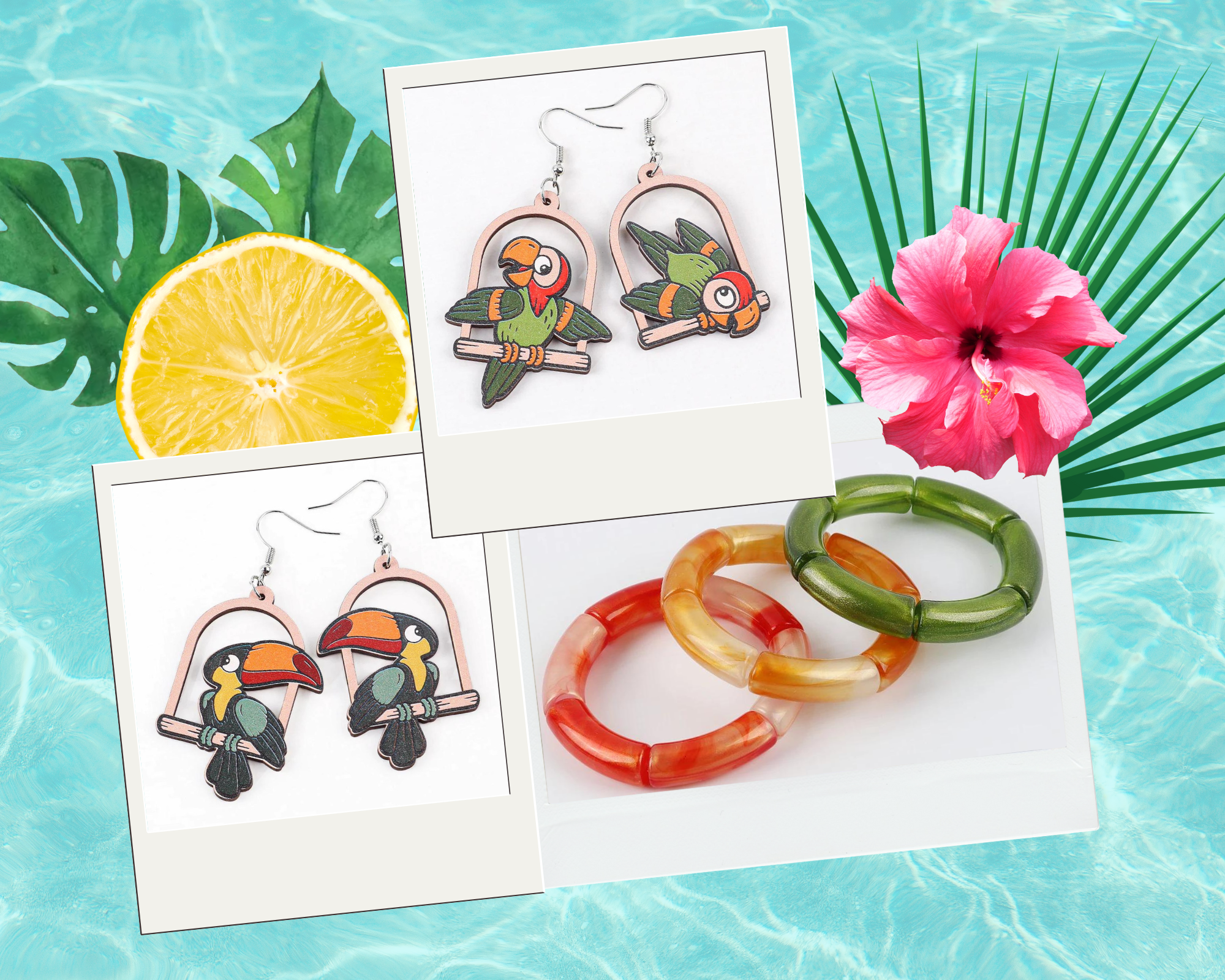 The Enchanted Tiki Earrings are meticulously handcrafted from high-quality wood, showcasing intricately-carved designs of cartoon parrots and toucans. Every pair is distinct, providing a charming and playful addition to any ensemble. To complete the whimsical, retro-inspired aesthetic, these earrings come with a set of three colorful acrylic tube bangles.