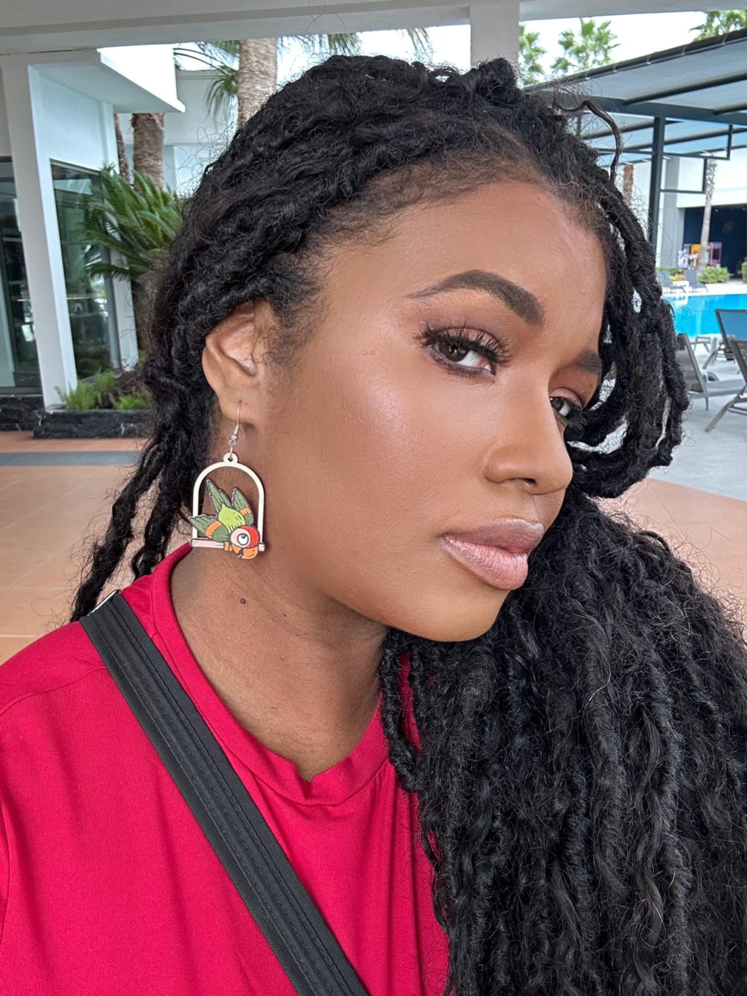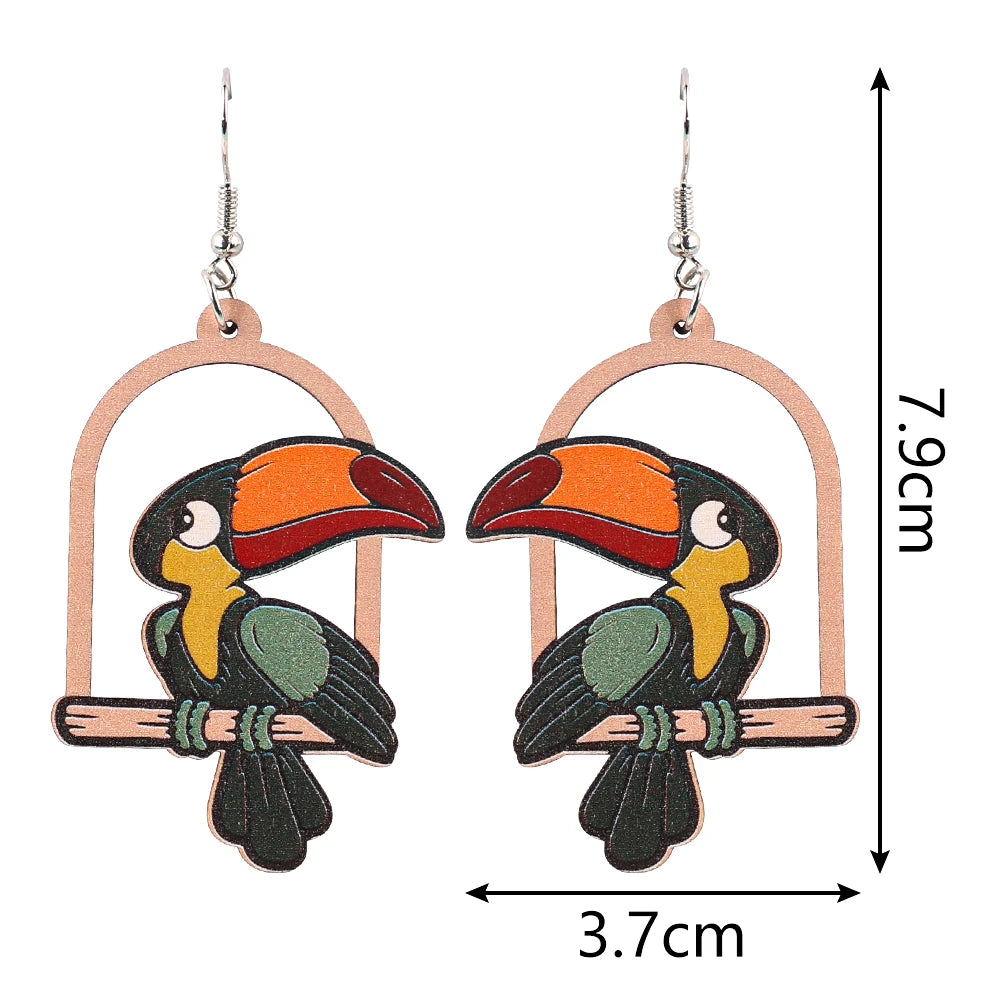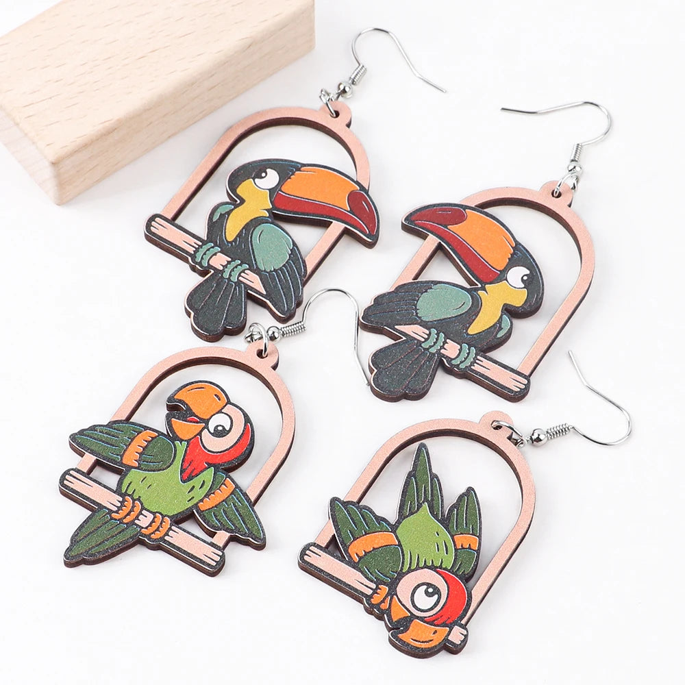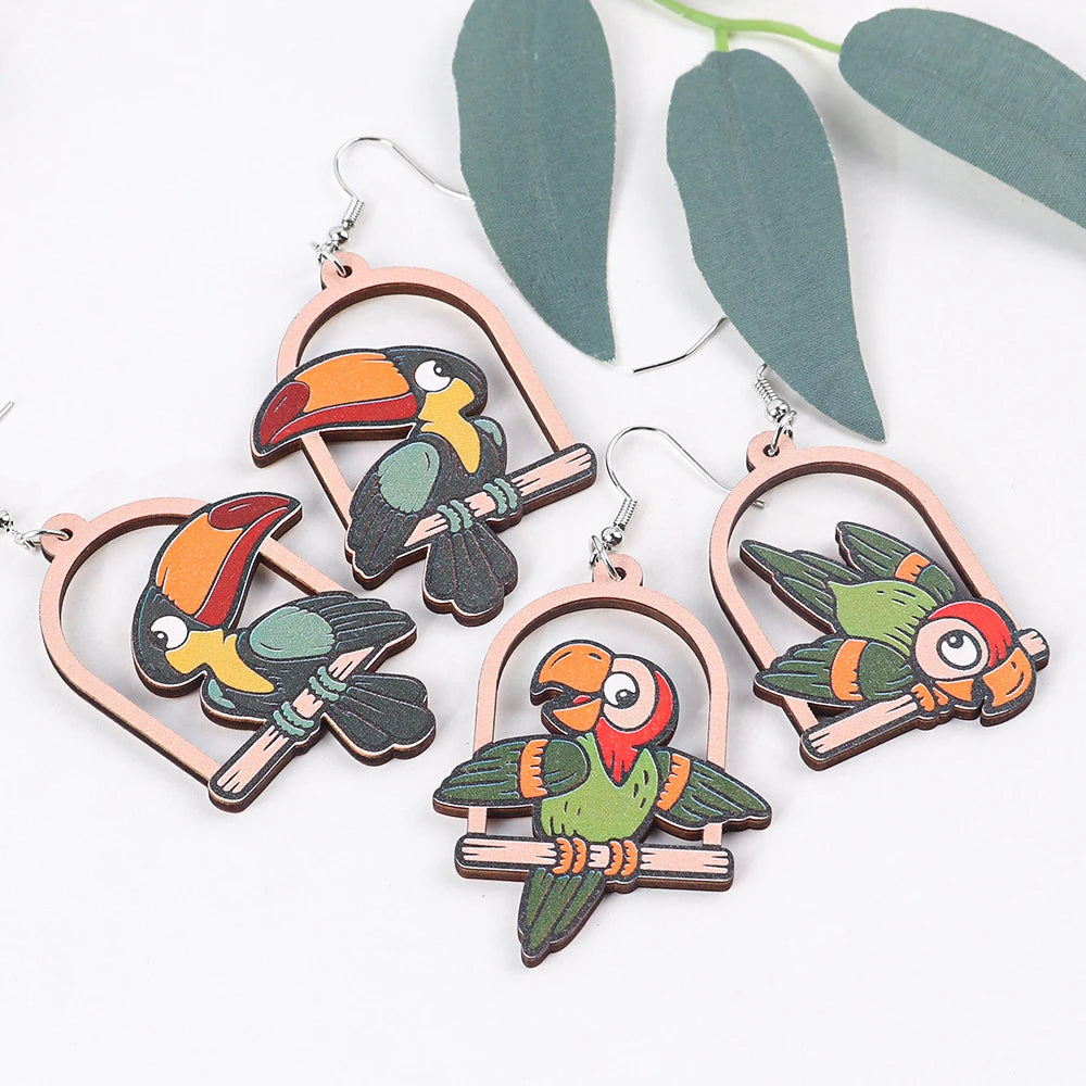 The Enchanted Tiki Earrings are meticulously handcrafted from high-quality wood, showcasing intricately-carved designs of cartoon parrots and toucans. Every pair is distinct, providing a charming and playful addition to any ensemble. To complete the whimsical, retro-inspired aesthetic, these earrings come with a set of three colorful acrylic tube bangles.