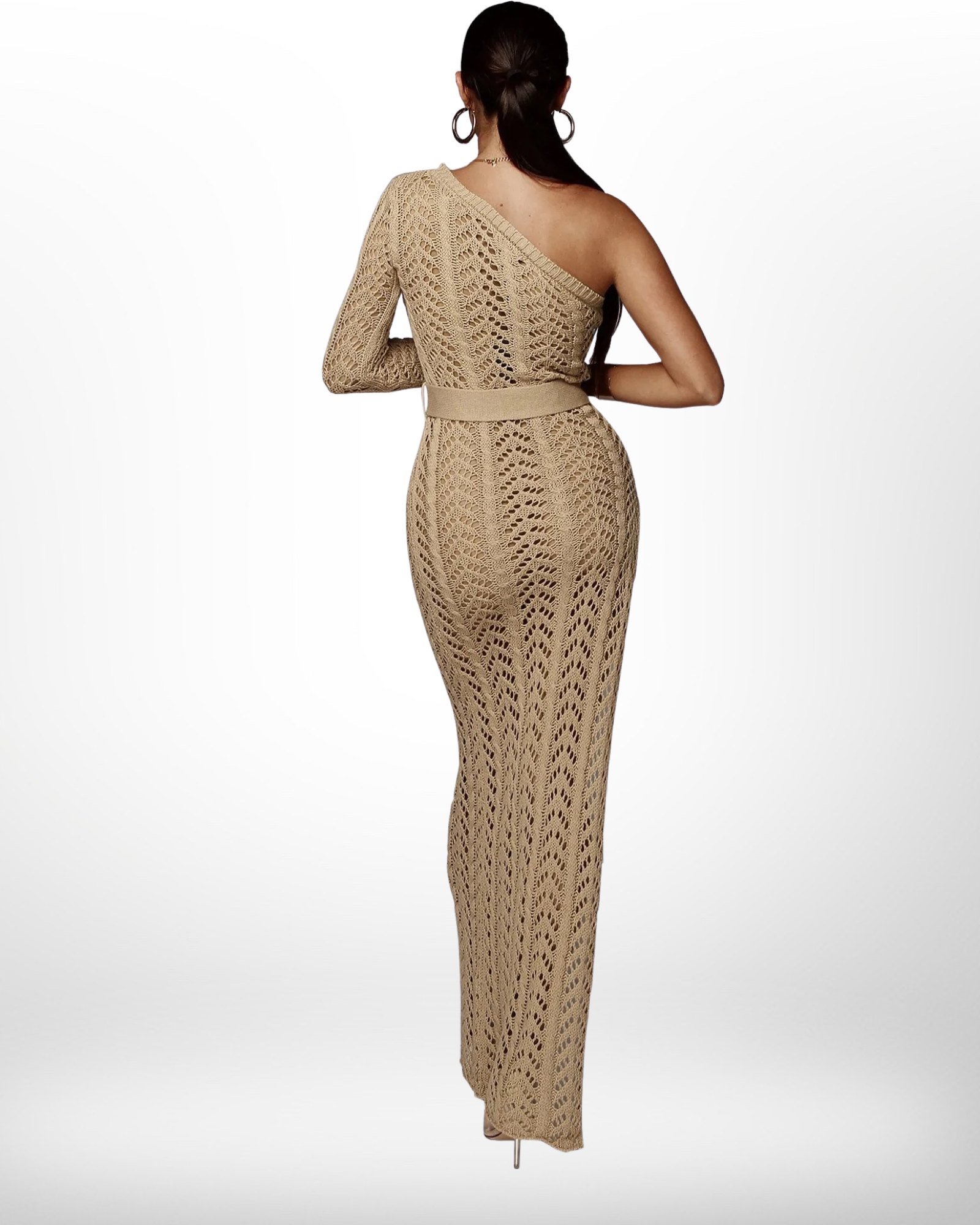 The Lily One Shoulder High Slit Knitted Dress is the perfect choice for a sexy and confident woman. Made with Crocheted material, this dress is sure to turn heads and make you feel good about yourself. The high slit provides an extra level of sexiness, while the one shoulder design ensures that you'll be the center of attention.