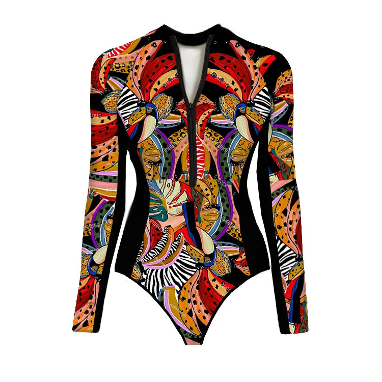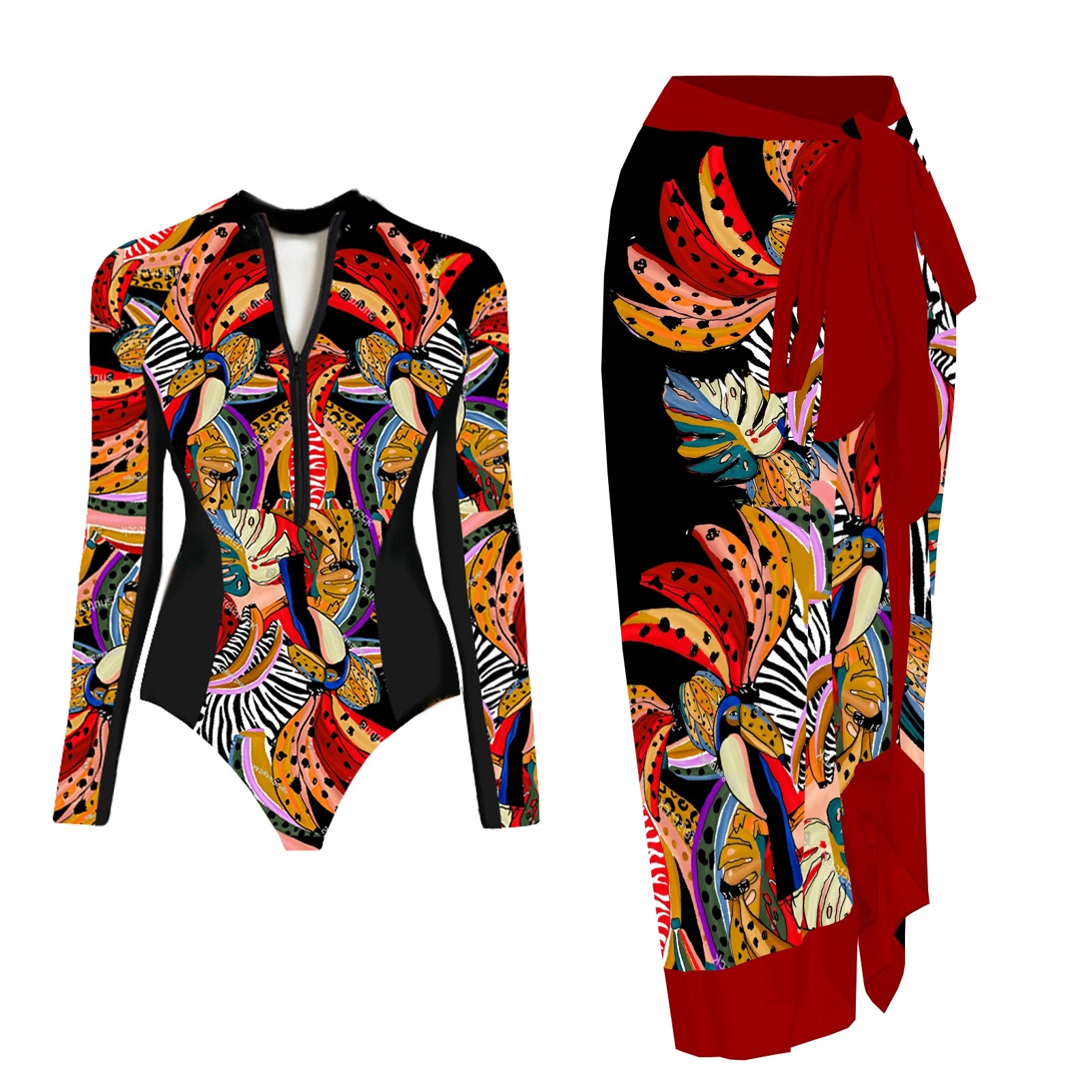 Coastal Muse One Piece Long Sleeve Swimsuit and Sarong in Exotic Red