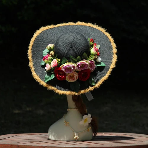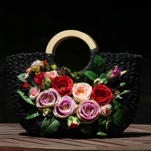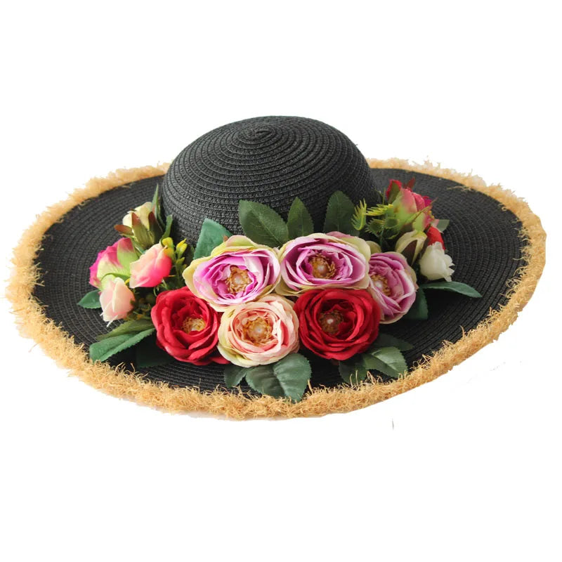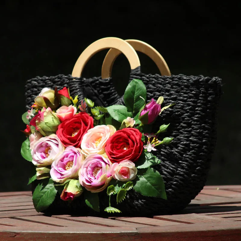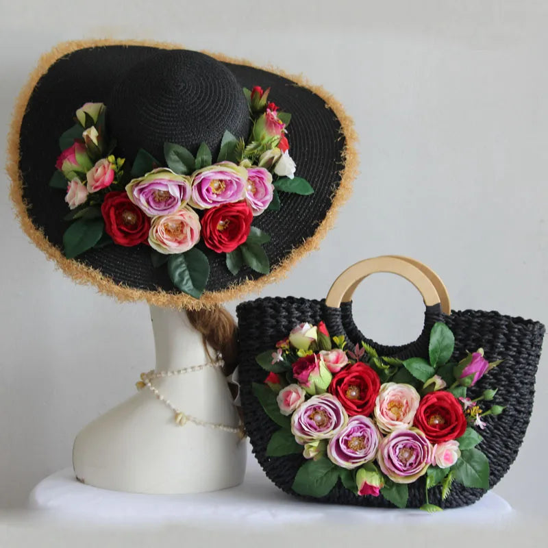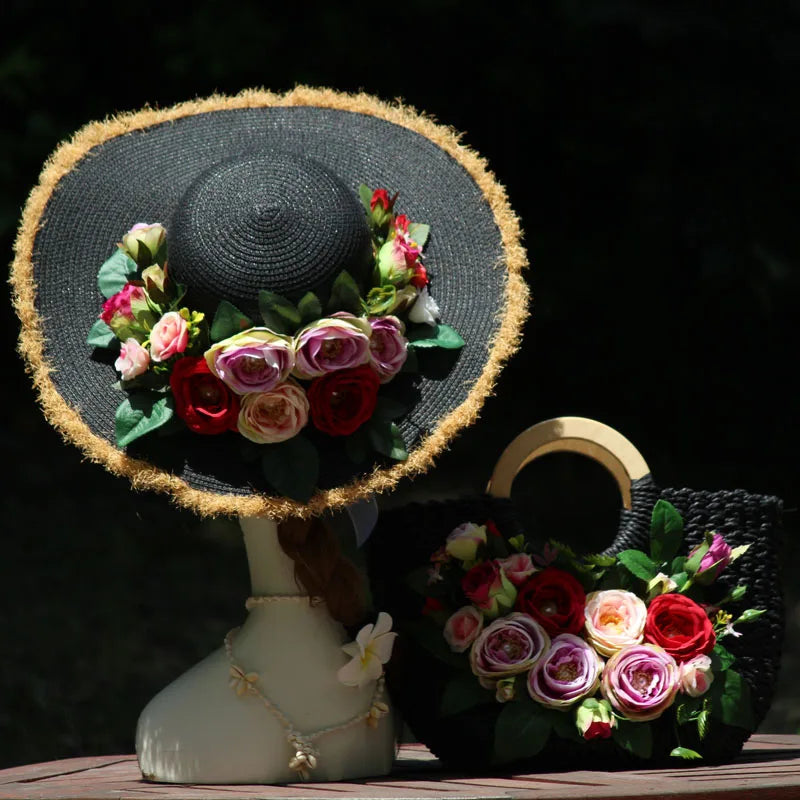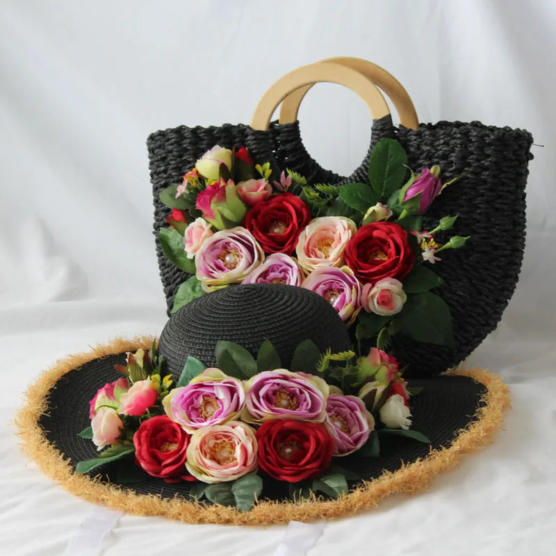 The Garden Party Duo Floral Hat and Tote Bag in Black
