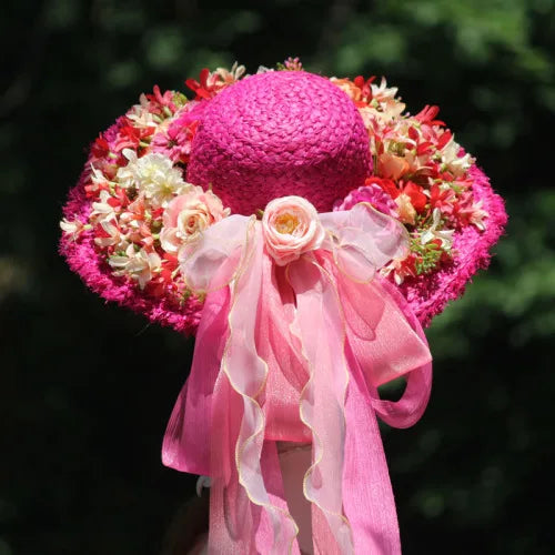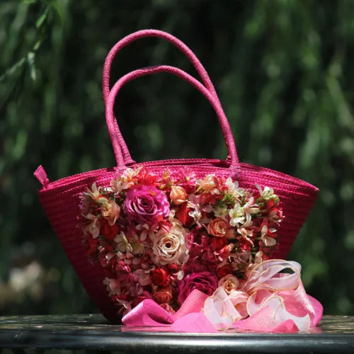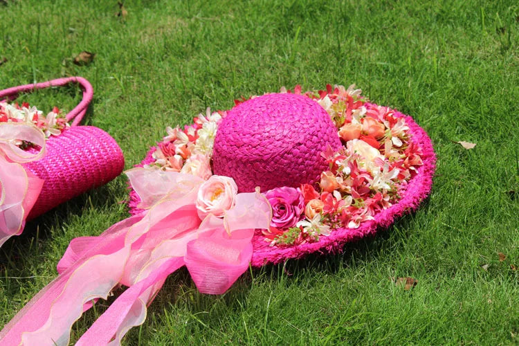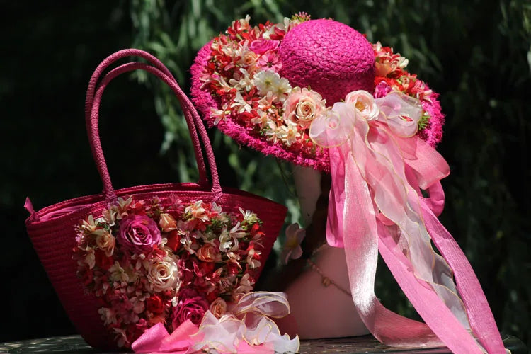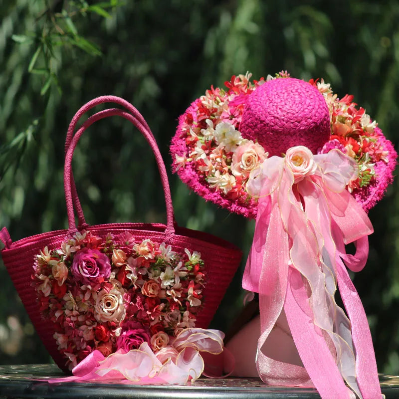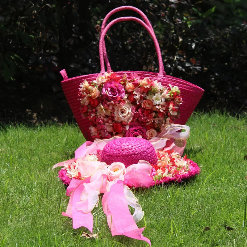 The Garden Party Duo Floral Hat and Tote Bag in Hot Pink
