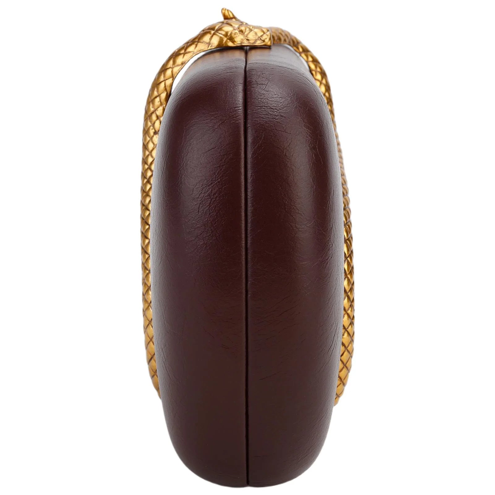 An elegant evening clutch crafted from premium vegan leather, featuring striking snake inspired hardware that elevates any formal ensemble. This box-shaped design combines timeless sophistication with modern glamour, offering a versatile accessory for special occasions. The long chain strap provides effortless versatility, transitioning seamlessly from evening events to upscale gatherings. A refined choice for the discerning woman seeking understated luxury.