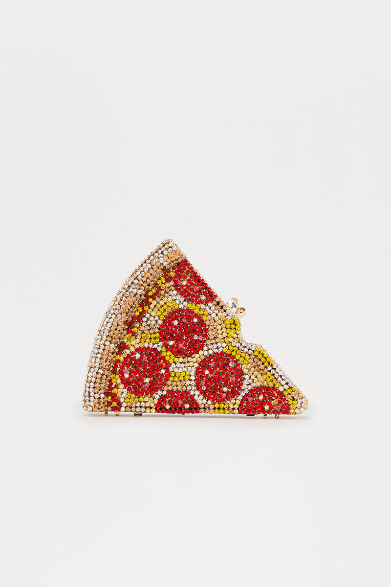Elevate your evening ensemble with this sophisticated Pizza Shaped Crystal Minaudiere Clutch. Crafted with sparkling crystals and detailed to resemble a pepperoni pizza, it offers a playful yet elegant statement piece. Perfect for adding a touch of whimsy to formal occasions while securely holding your essentials in style.