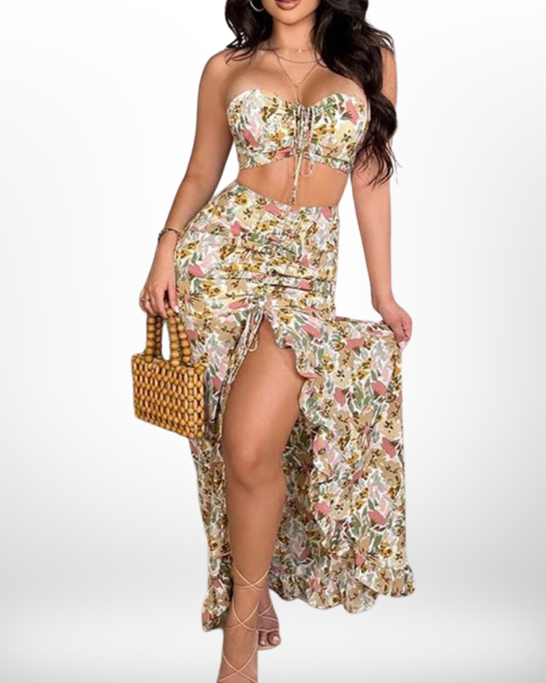 Offering an abstract floral print on this adorably flirty 2 piece set. A tube style ruched top tied with a bow and hip hugging ruched floor length skirt that offers a perfect thigh revealing slit is ready for you to drink cosmos on a picnic blanket at the park with your boo. Or solo to get that boo you been eyeing!