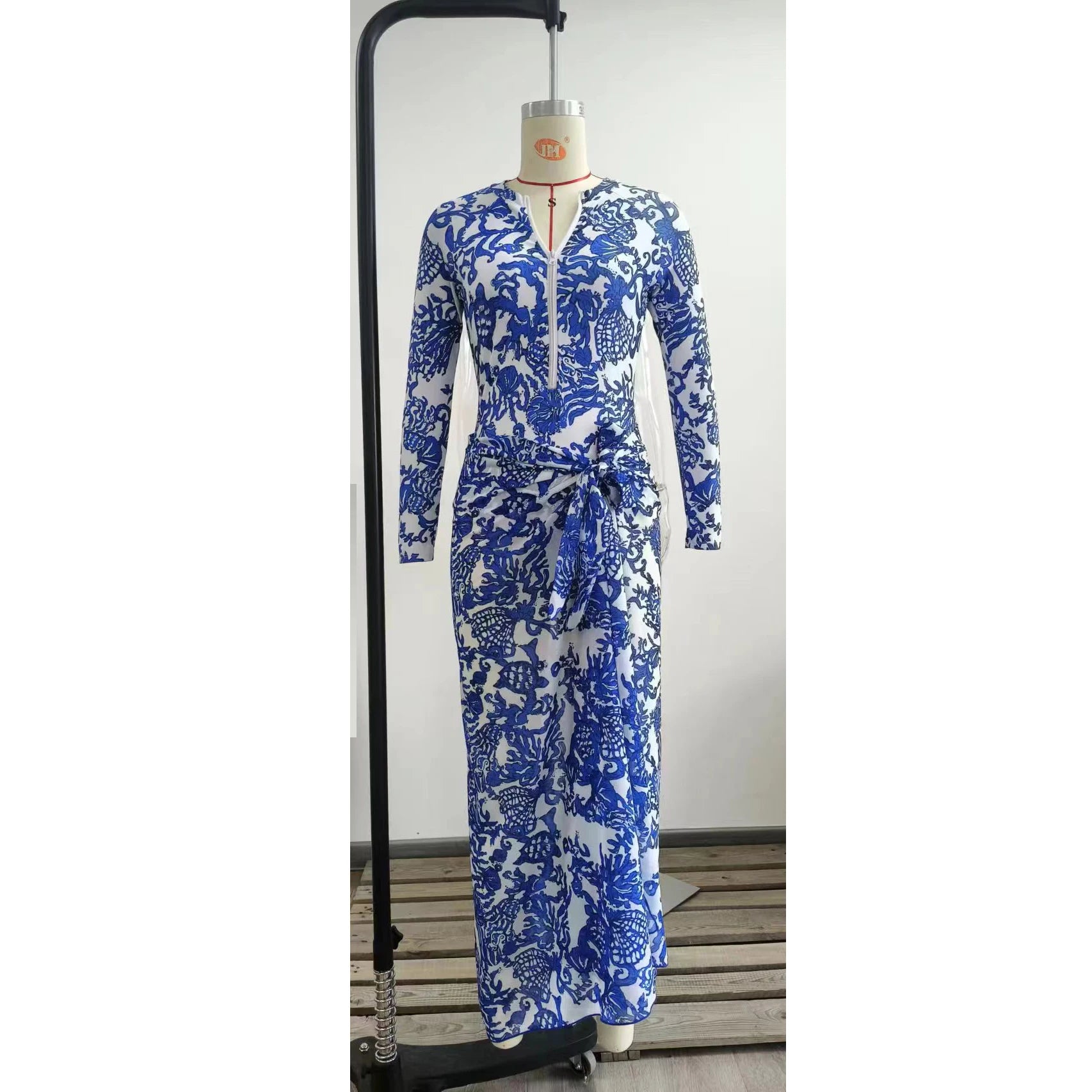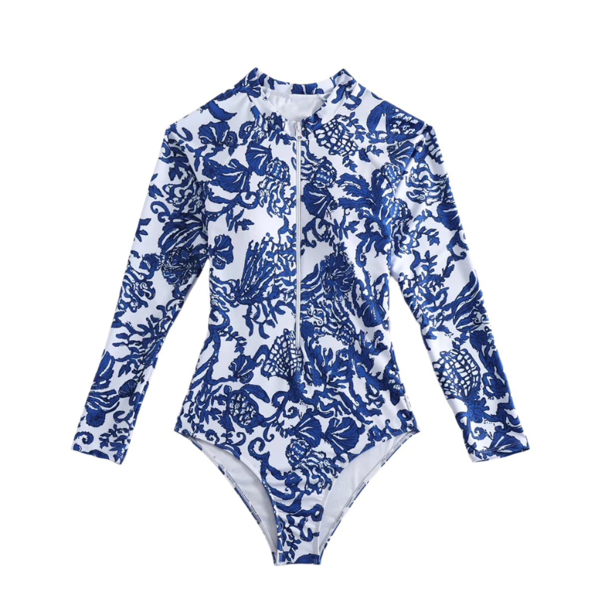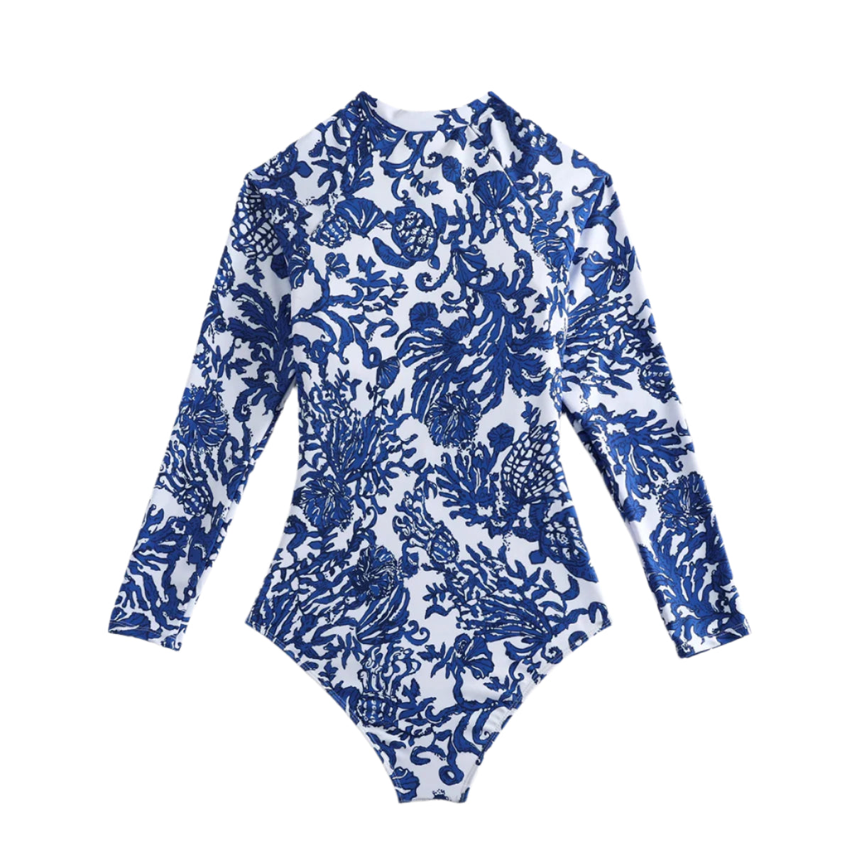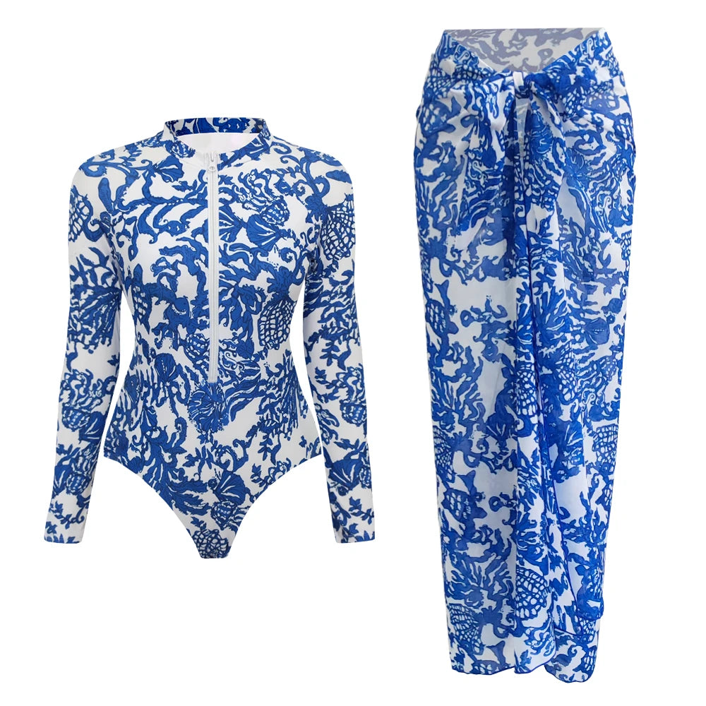 Coastal Muse One Piece Long Sleeve Swimsuit and Sarong in Blue and White