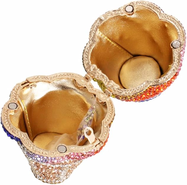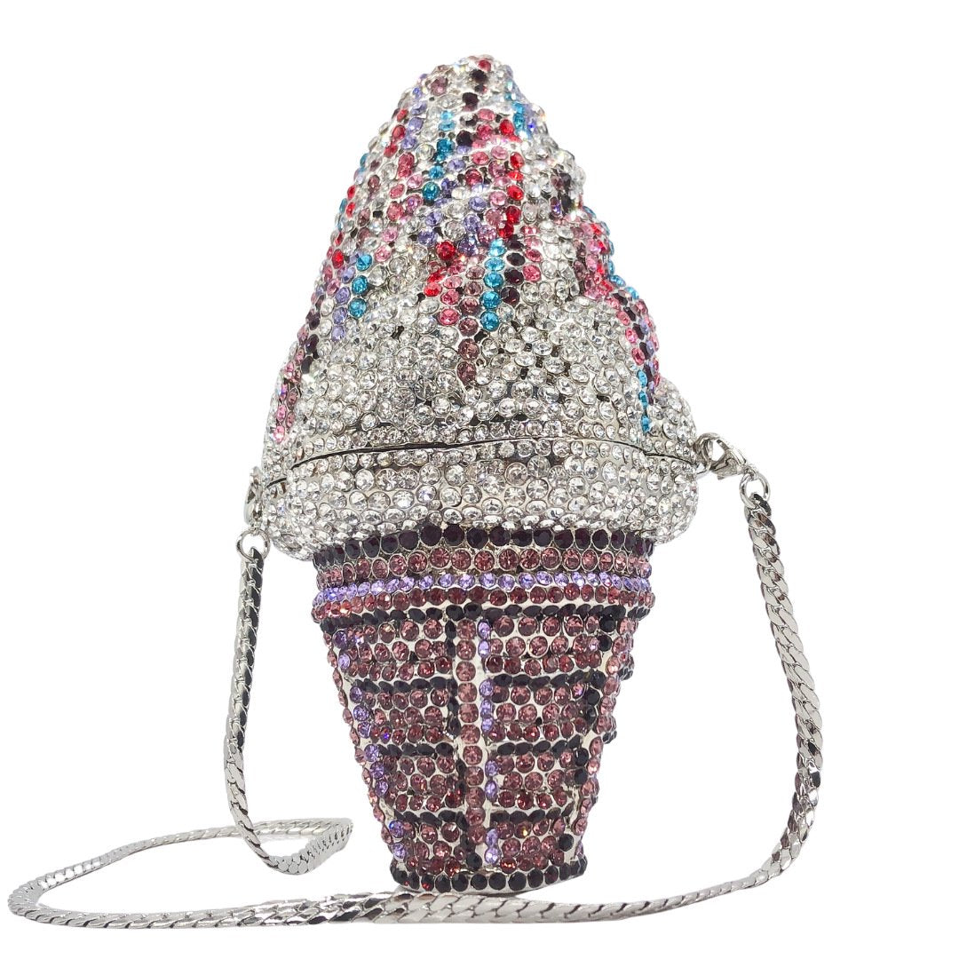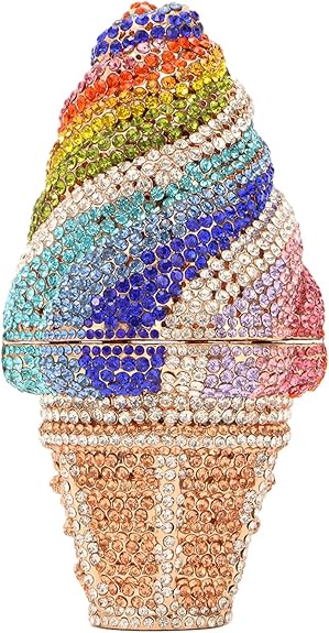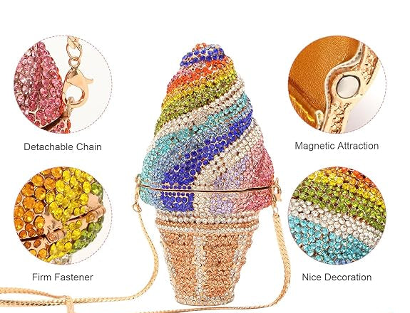 Add a scoop of sparkle to your look with this Ice Cream Cone Crystal Minaudiere. Shaped like a whimsical ice cream cone and adorned with dazzling crystals, it’s the perfect playful accessory to sweeten any outfit. Compact yet eye-catching, this minaudiere is ideal for carrying your essentials with a fun, fashionable twist.