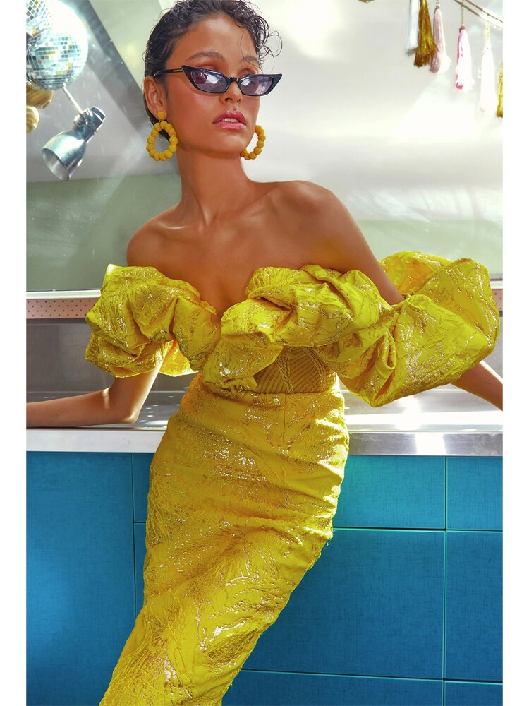 Vente d'échantillons de robe jacquard jaune en maille Havana Nights