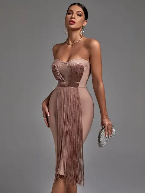 Indulge in luxury and sophistication with our Sienna Tassel Bandage Dress. Crafted with tassel details, this dress exudes elegance and exclusivity. The perfect choice for any special occasion, it will hug your curves and accentuate your figure, making you the center of attention. Elevate your wardrobe with this timeless piece.