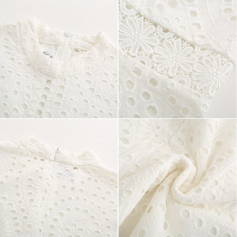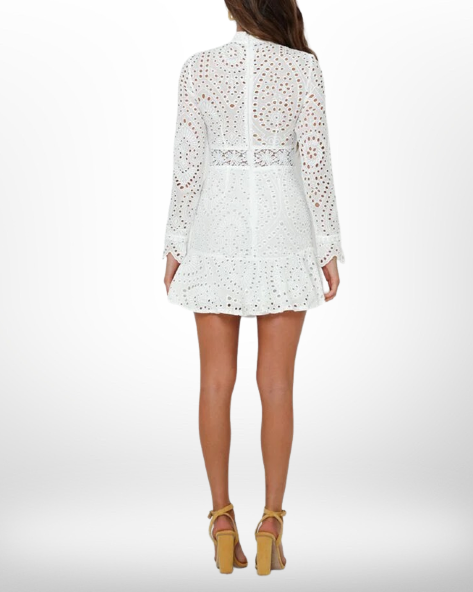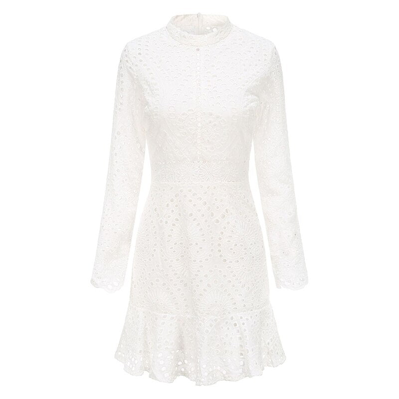 This elegant white lace mini party dress is perfect for any special occasions. With its beautiful lace embroidery and delicate ruffles, this dress is sure to turn heads. Made from high quality materials, it's perfect for any formal event. Whether you're going to a wedding or simply want to feel special for a night out, this gorgeous mini dress is just what you need.