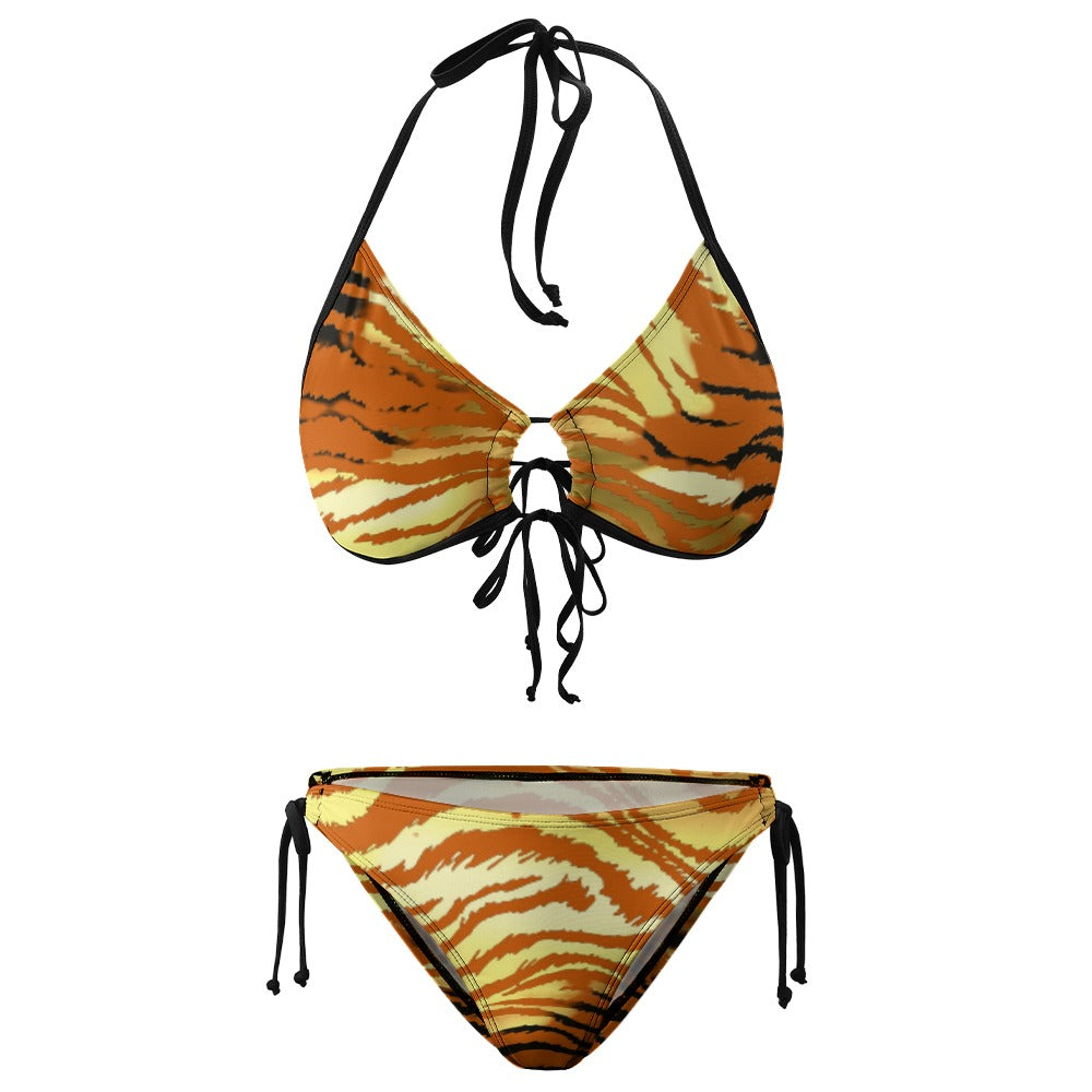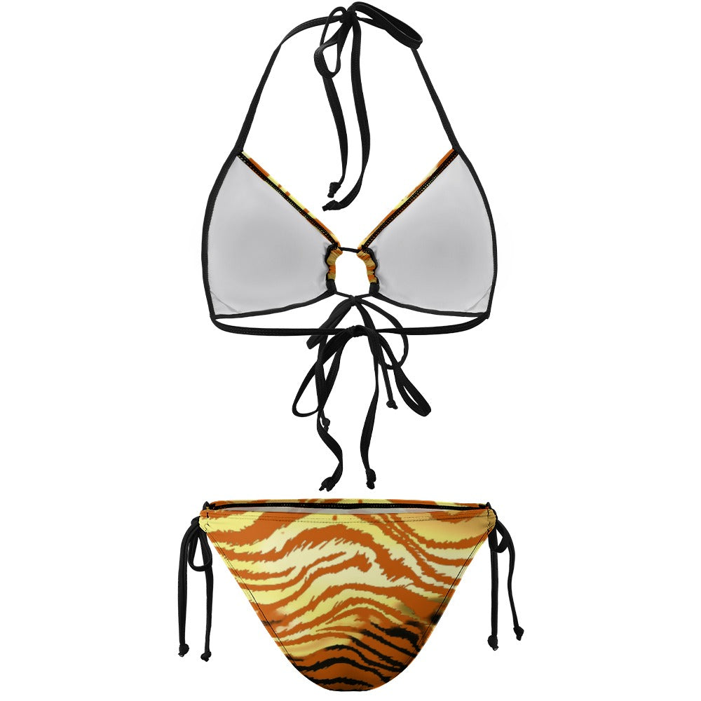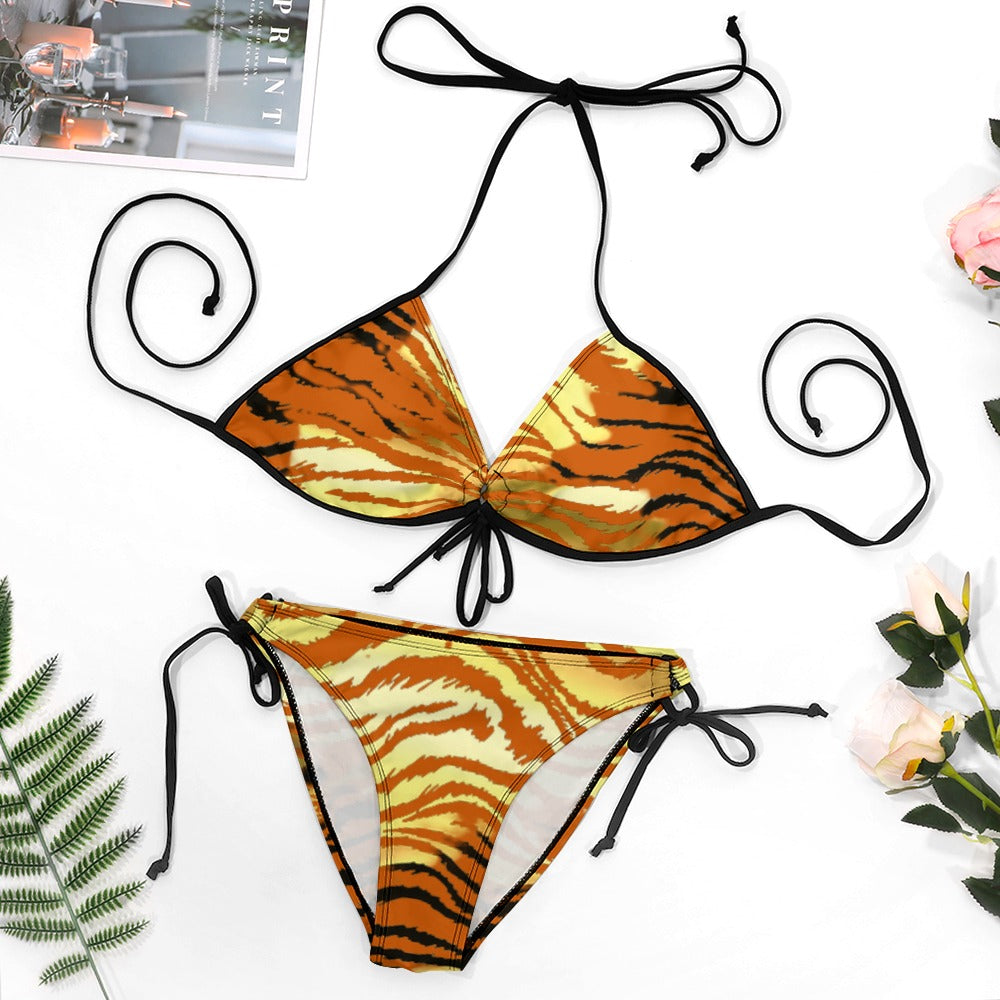 The Golden Tiger Plus Size Bikini features a classic triangle shaped top with a strappy back detail and a matching tie bottom. It has adjustable straps, chic design for a comfortable swimming experience. This suit features a cinched detailing, side ties, low-waisted pant, gathers at the top and bottom tie sides to help adjust the fit.